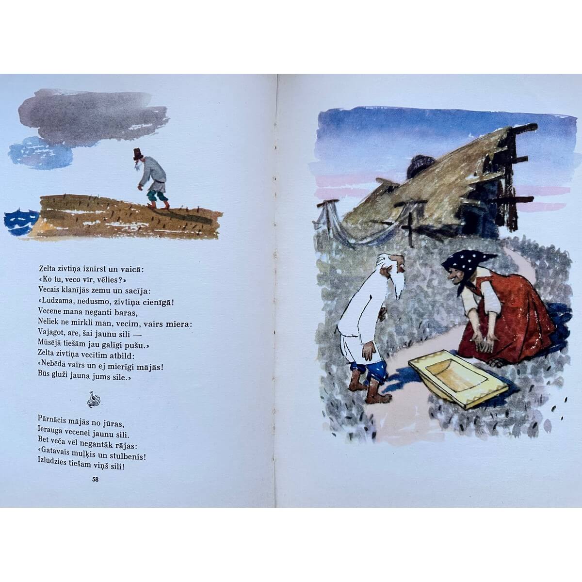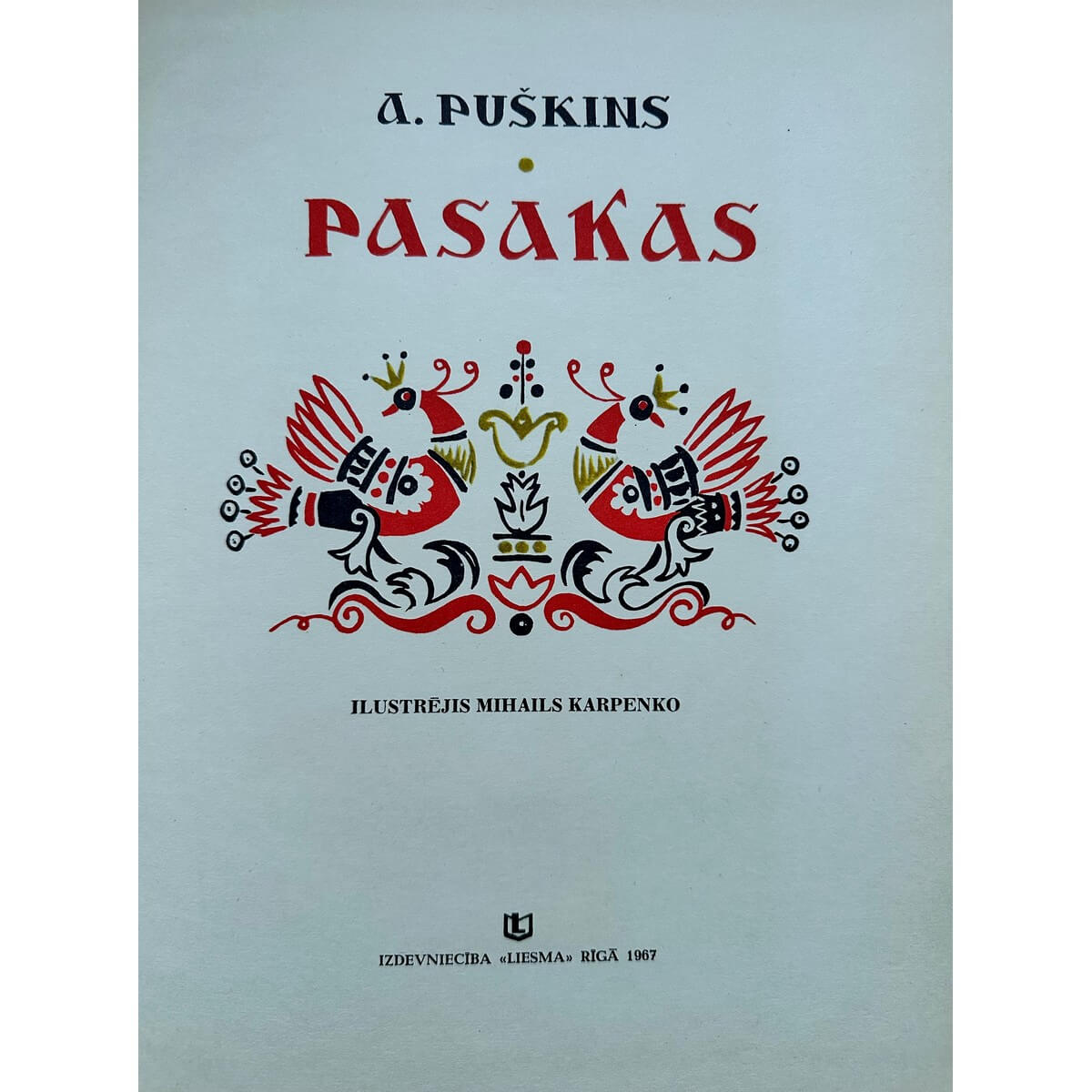 Пушкин, Александр Сергеевич, Pasakas : [jaunākā un vidējā skolas vecuma bērniem] / A. Puškins ; [atdzejojuši J. Vanags un J. Plaudis] ; ilustrējis M. Karpenko. Rīga : Liesma, 1967. 129, [2] lpp. : il. ; 29 cm.