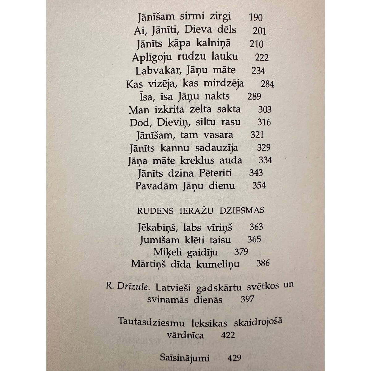 Latviešu tautasdziesmas : gadskārtu ieražu dziesmas / sakārtojusi Rita Drīzule ; Valdis Villerušs, mākslinieciskais noformējums. [Rīga] : Jāņa Rozes apgāds, ©1998 429, [1] lpp. ; 18 cm. ISBN 9984623025 (iesiets).