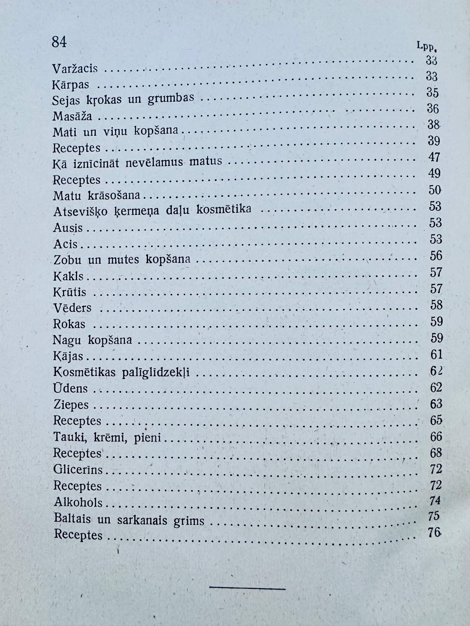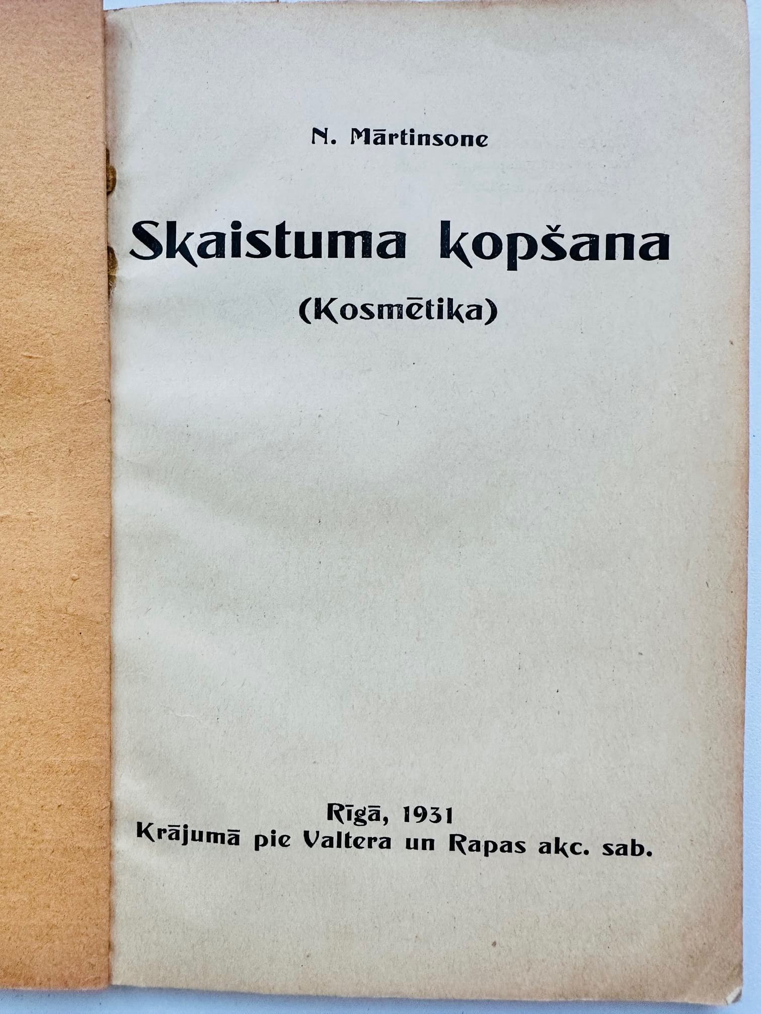 Martinsone, Nora, Skaistuma kopšana : (kosmētika) / Nora Mārtinsone. Rīga : Valters un Rapa, 1931. 84 lpp. ; 19 cm.