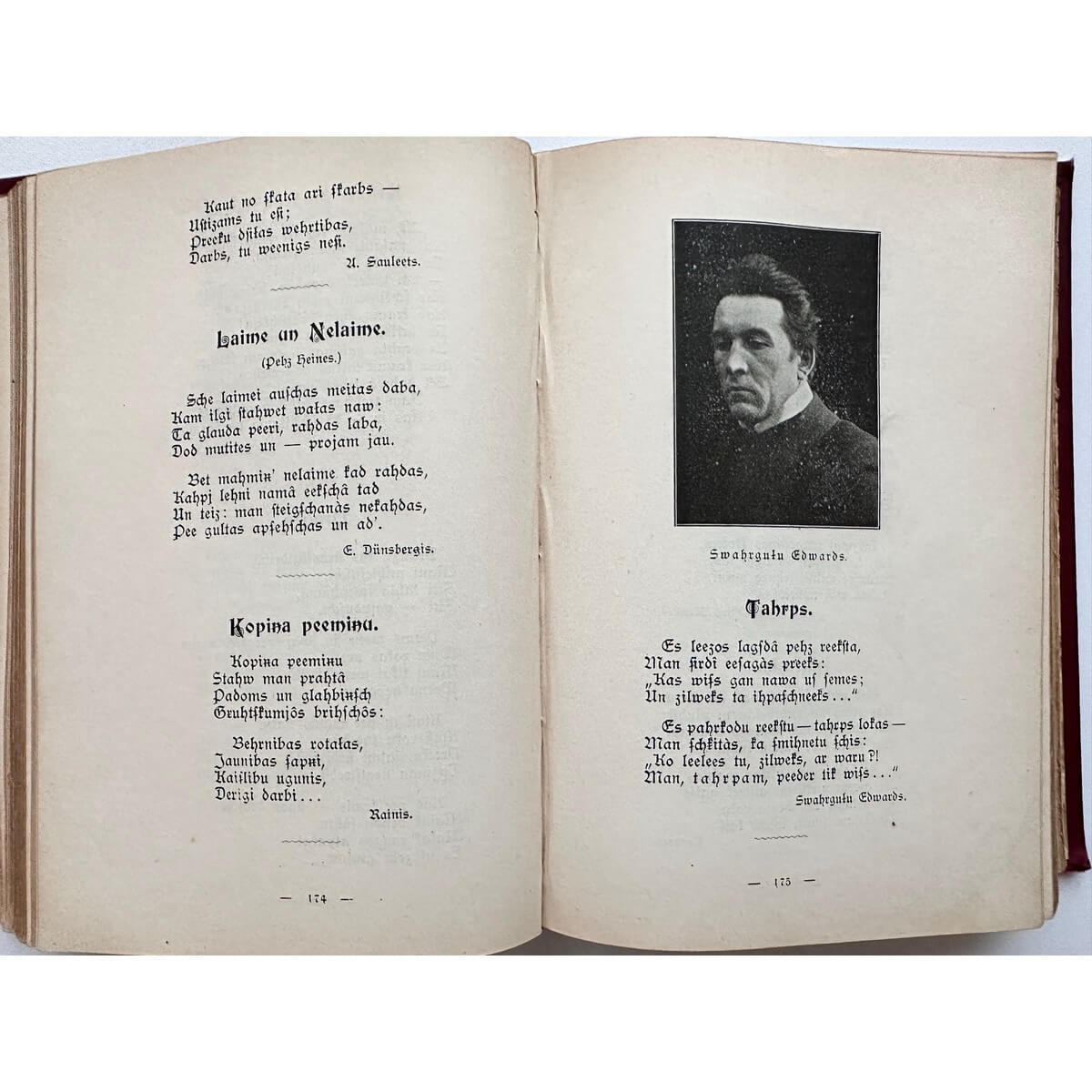 Matīsa Kaudzītes sastādītā grāmata ''Smaidi un asaras'' iesieta greznos jūgendstila vākos. Vāka burti un lapu malas zeltītas.
