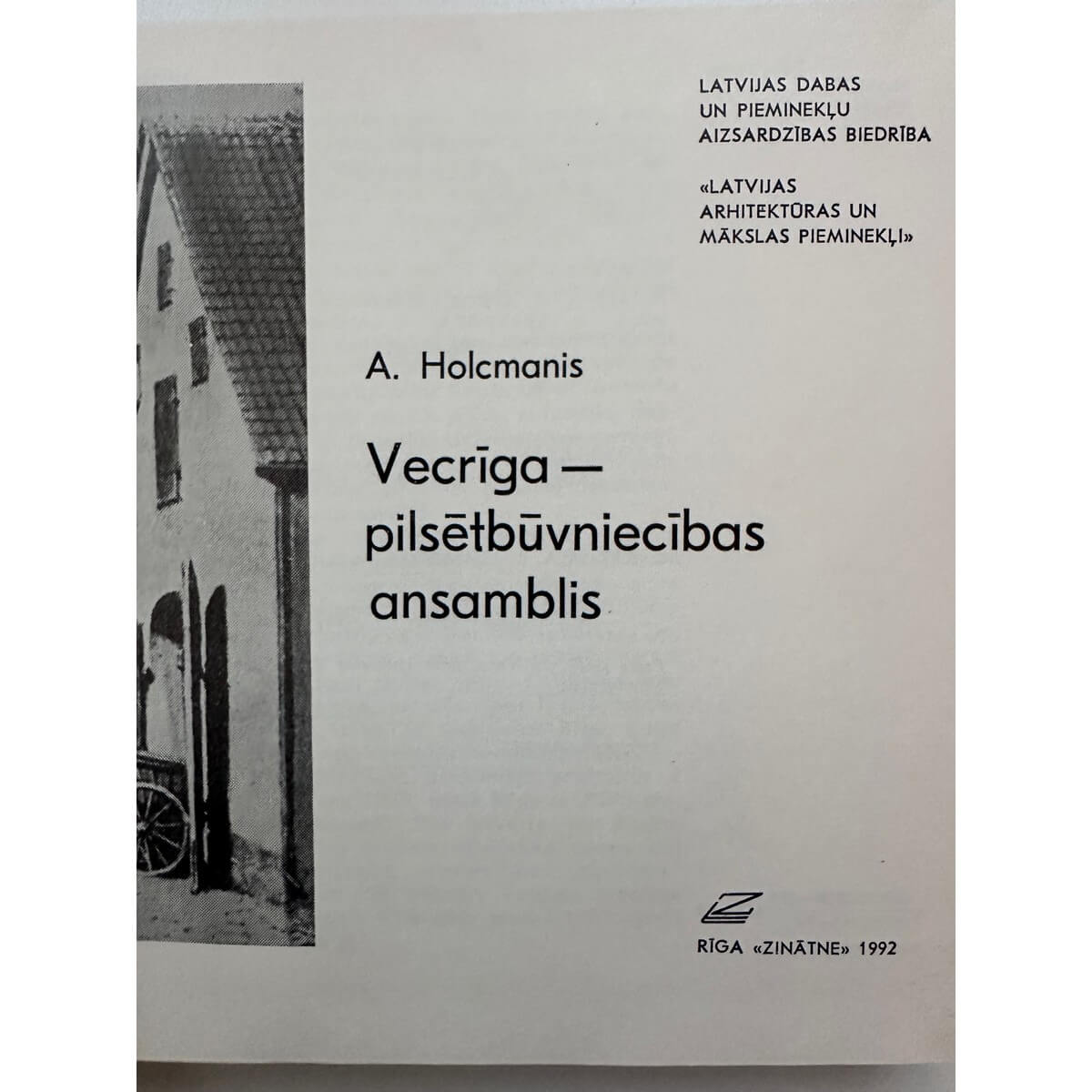 Holcmanis, Andrejs, Vecrīga - pilsētbūvniecības ansamblis / A. Holcmanis ; [redaktore S. Cepurniece] ; Latvijas Dabas un pieminekļu aizsardzības biedrība. Rīga : Zinātne, 1992. 252, [2] lpp. : il. ; 18 cm. Latvijas arhitektūras un mākslas pieminekļi . ISBN 5796604740 (iesiets).