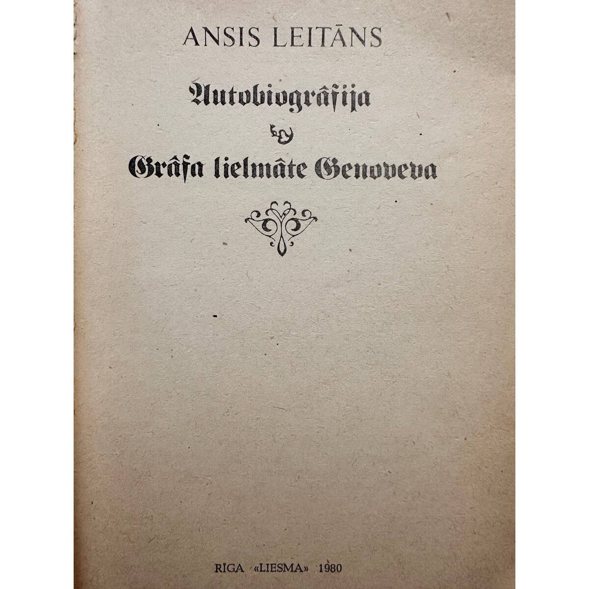 Leitāns, Ansis, Autobiogrāfija ; Grāfa lielmāte Genoveva / Ansis Leitāns ; [tekstu publicēšanai sagatavojusi priekšvārda un komentāru autore, sastādītāja Ingrīda Kiršentāle ; redaktore S. Radzobe ; Viestura Granta mākslinieciskā apdare]. Rīga : Liesma, 1980 190, [1] lpp. : ilustrācijas ; 17 cm.