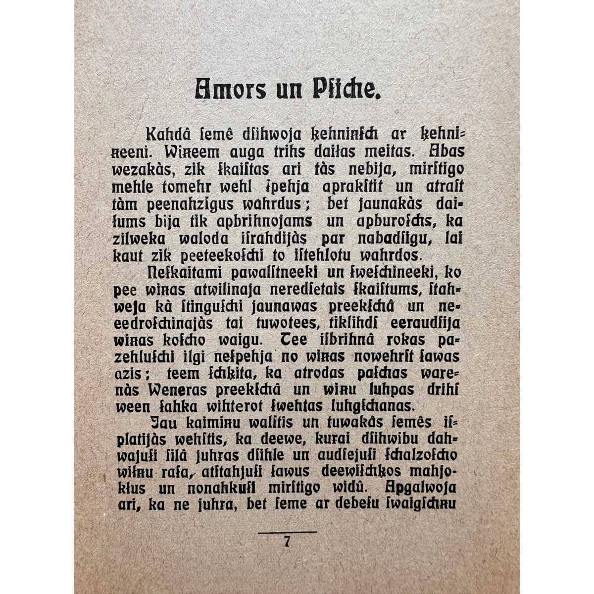 Apulejs Amors un Psiche / Apuleja stāsts ; no latīņu valodas tulkojis Augusts Ģiezens. Rīga : "Ausmas" apg., [1922]. 63 lpp. ; 17 cm.