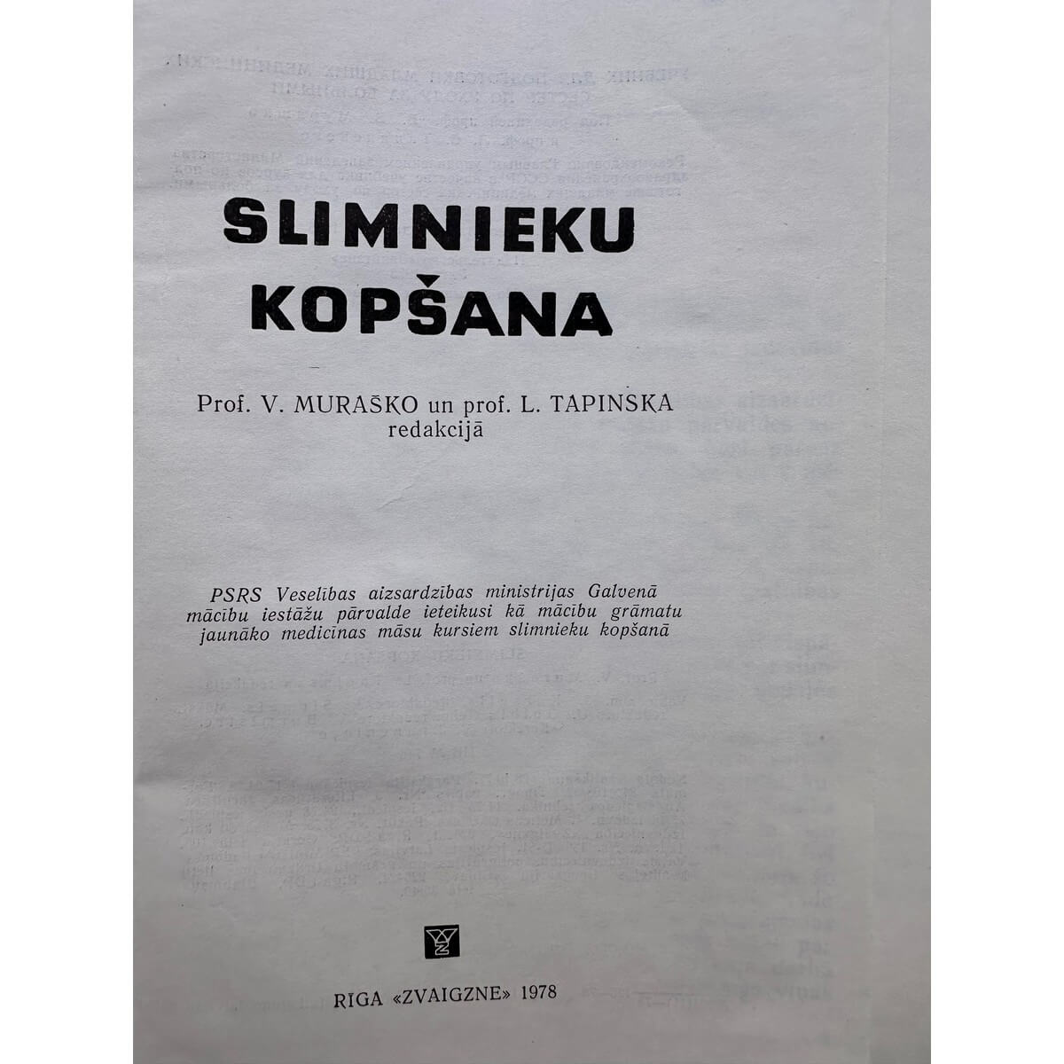 Slimnieku kopšana : mācību grāmata jaunāko medicīnas māsu kursiem slimnieku kopšanā / V. Muraško, L. Tapinska redakcijā. Rīga : Zvaigzne, 1978. 472 lpp. : ilustrācijas ; 20 cm.